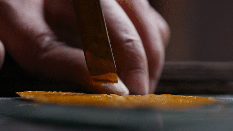 画一幅漆画,从制作漆板到完成画面,大概得花六到八个月的时间。而此时作品并未真正完成,漆有自己的生长期,随着时间延长,漆的颜色会变,俗话称画面“开了”。这个过程得再等上四个月,一晃眼,一年就过去了。