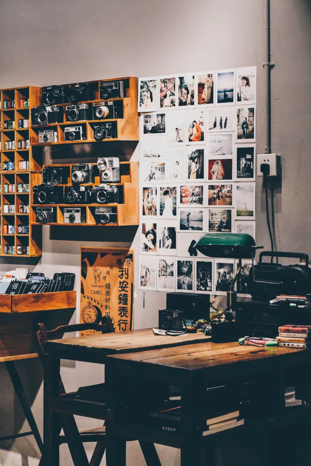旧里堂这个空间,从里到外都散发着“怀旧”的氛围。老胶卷老相机老物件,还有许多充满回忆的照片,都是因为 24-航本人对旧事物的着迷和喜爱。包括“旧里堂”这个名字,灵感来源于他小时候住的祠堂,很怀念小时候的时光和祠堂的里屋,于是有了这个店名。