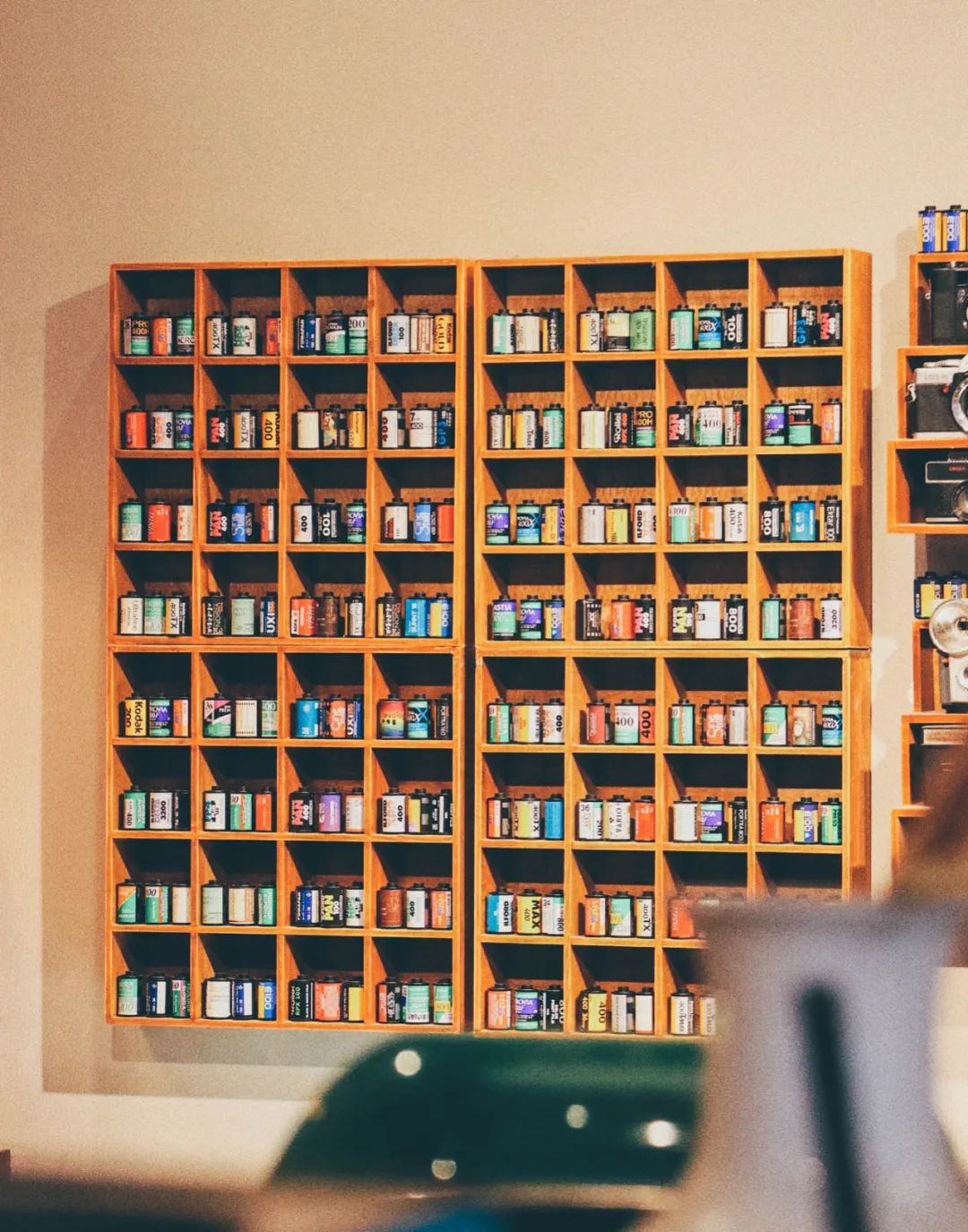 咖啡店也是自由胶片摄影师 24-航的“私人小型展览馆”。这里展出了24-航收藏的 27 台胶片相机,它们都来自过去,年代不同破损度也不同;展出了拍摄过的胶卷们,放置了满满一墙(当然真正拍摄的胶卷数量远不止这些),它们在帮着摄影师储存过去;还有那些来自 70-90 年代的中式家具,这些都是从 24-航妻子的奶奶家里搬来的,客人们可以正常使用这些沙发、桌子、灯具,跟着它们暂时来一段时光旅行。当然,还有墙上、柜子上随处可见的照片,都记录着画中人的故事。