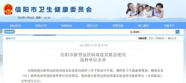 信阳市新型冠状病毒疫苗紧急使用接种单位名单公示