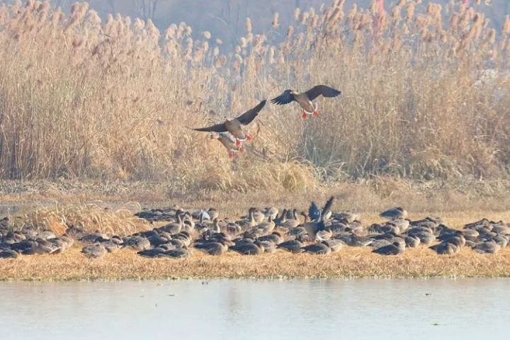 由于环境的不断改善,湿地一年四季都有鸟类在此繁衍生息。远望水天一色,云蒸霞蔚;近观碧波荡漾,鸥鹭齐飞,天鹅与大雁共舞。据有关部门不完全统计,这里常年有数万只鸟类在此筑巢。发现各种鸟类130多种,其中国家一级保护动物丹一顶鹤、白鹳、朱鹳3种。被列入濒危野生动物、植物种国际贸易公约鸟类11种。宿鸭湖,名副其实的鸟儿天堂。
