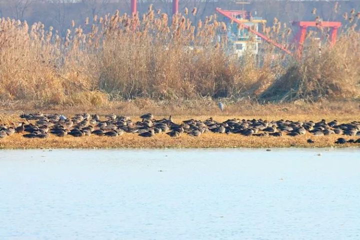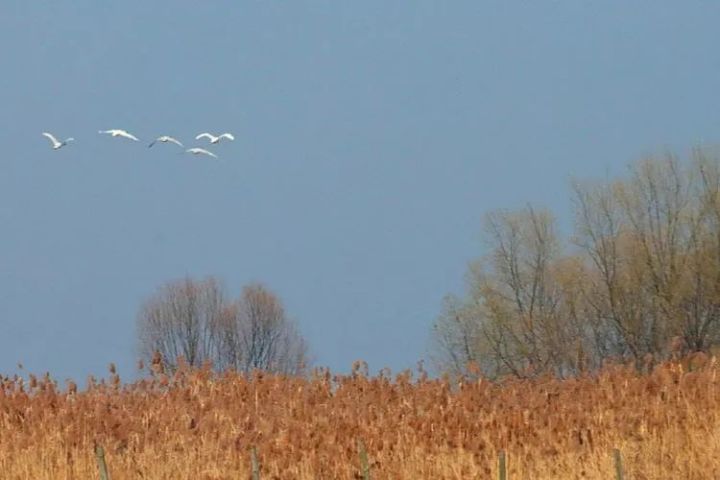 从张斌老师那里得到了拍白天鹅的真址,我们迫不及待地赶到了宿鸭湖红船处。天色灰暗,成片的芦苇荡随风起舞。只闻天鹅叫,不见天鹅影,原来白天鹅都隐藏到芦苇荡里。尝试着各种途径向芦苇荡里的白天鹅靠近,但由于宿鸭湖眼下正清淤扩容,一条条小水沟阻断了前往芦苇荡里的土路。扫兴返回,站在红船处,拍到了偶尔一群翩飞的大雁。太阳快要西落时,身边来了几位巡察宿鸭湖的警察,还有两位记者在采访一位手持相机的摄影人。我猜测那人一定是张斌老师,只是缘于他在被记者采访不便打扰,便抓拍了他接受采访的场景图片发到自己的微信朋友圈。