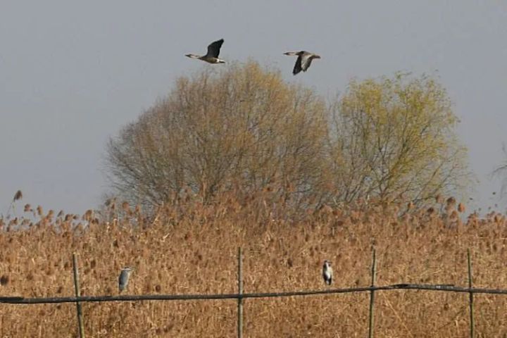 宿鸭湖的水域濒临张楼、罗店两个乡镇,其中罗店湿地面积最大,是越冬鸟儿吃食的集居地。与张斌老师分别后,我们径直沿着宿鸭湖东大坝下面的乡村路,又向罗店方向奔去。