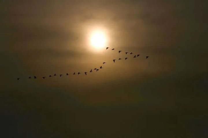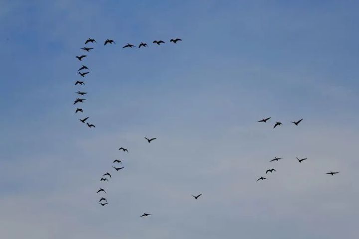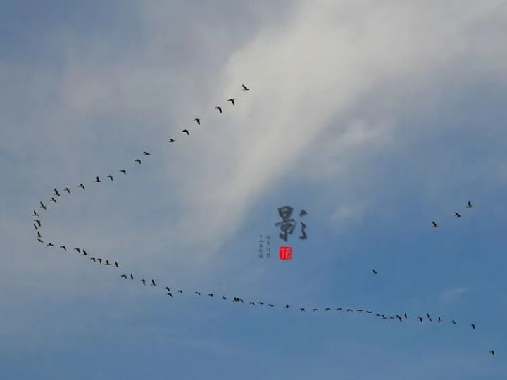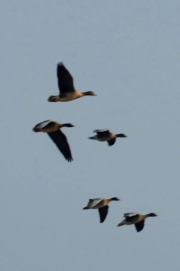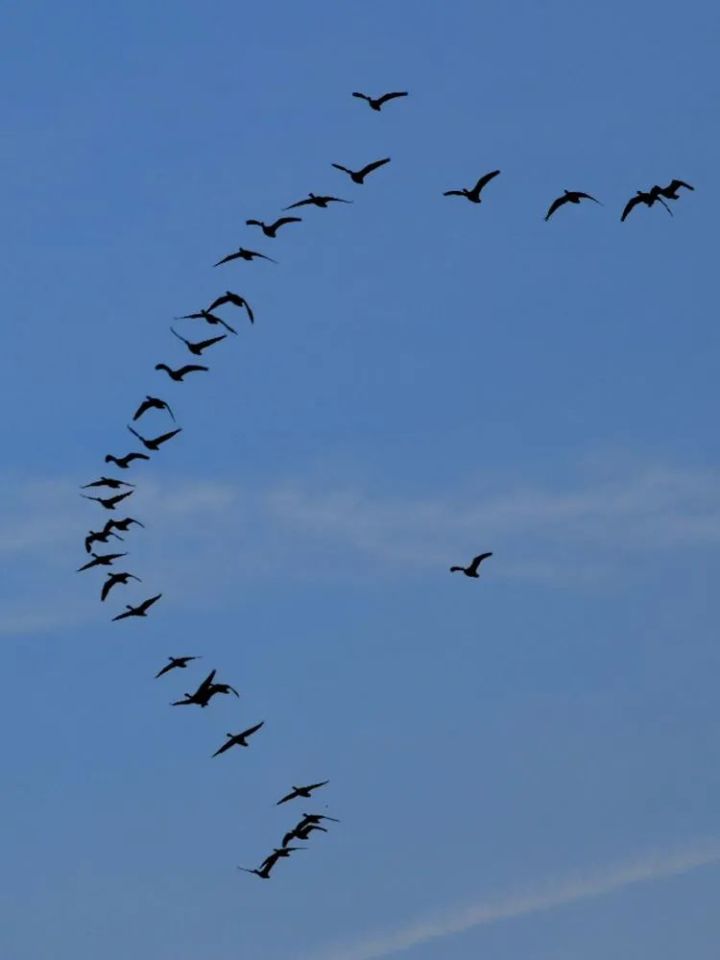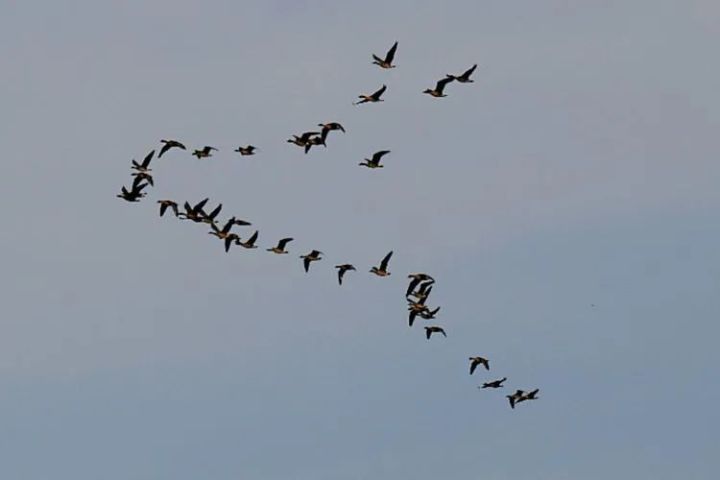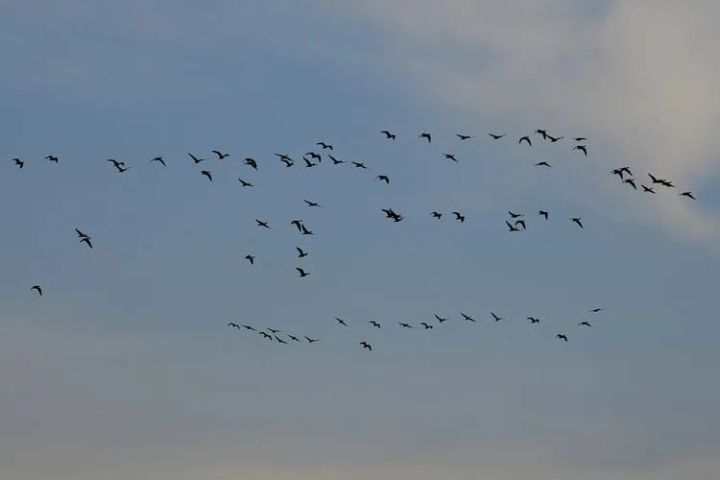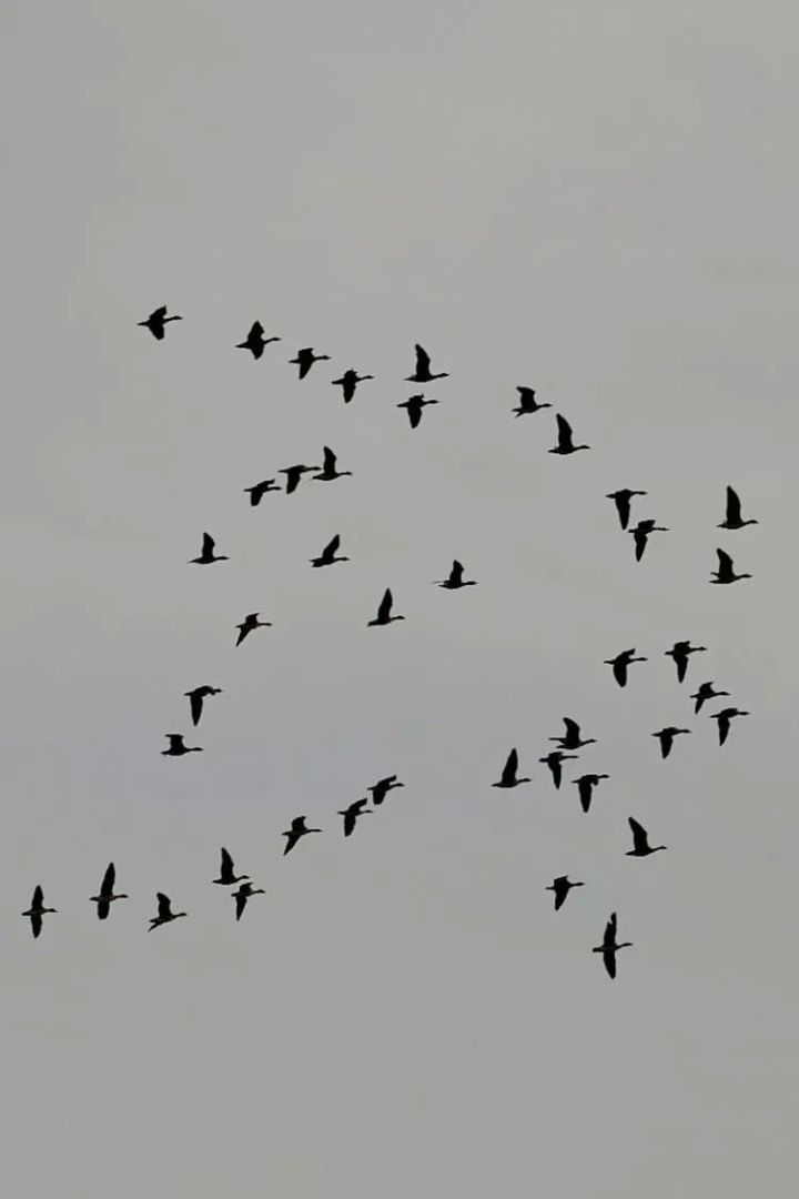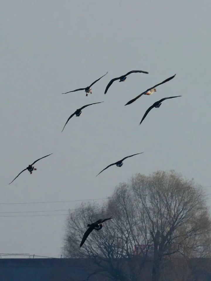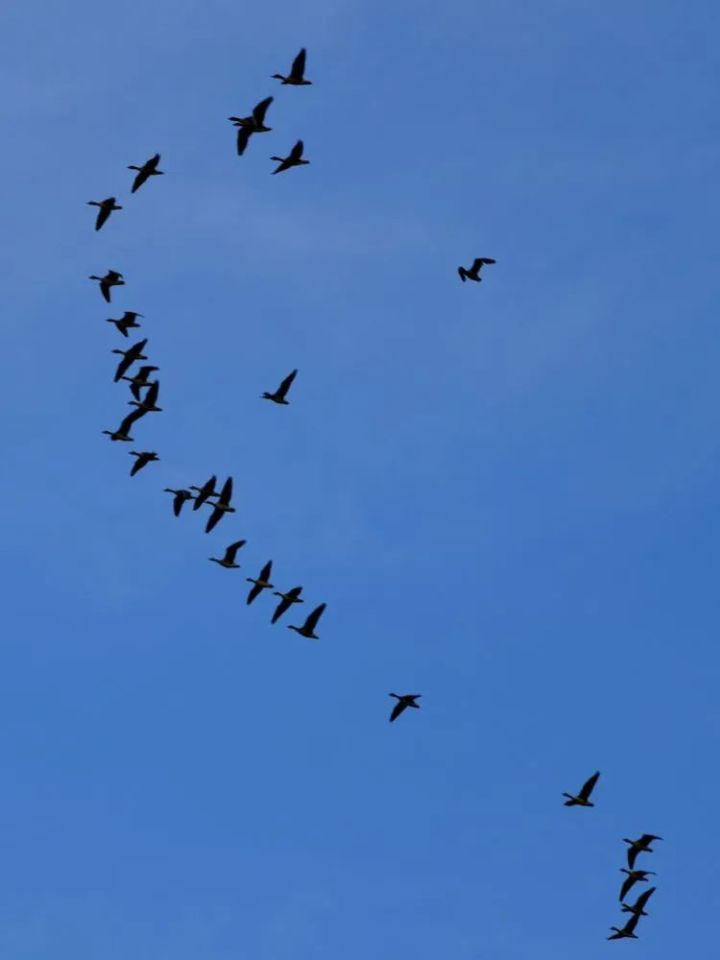 没过多久,成群结对的大雁便在我们头顶飞来飞去,果然像大爷所说的那样壮观。我们很快被这遮云闭日的候鸟群所倾倒,它们时而还变换着队形好像在为我们努力表演着什么。