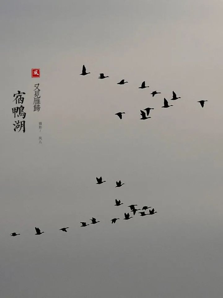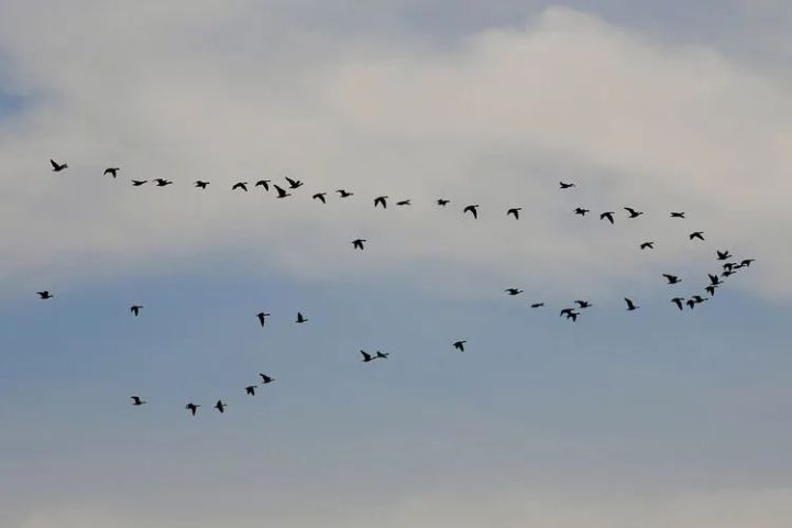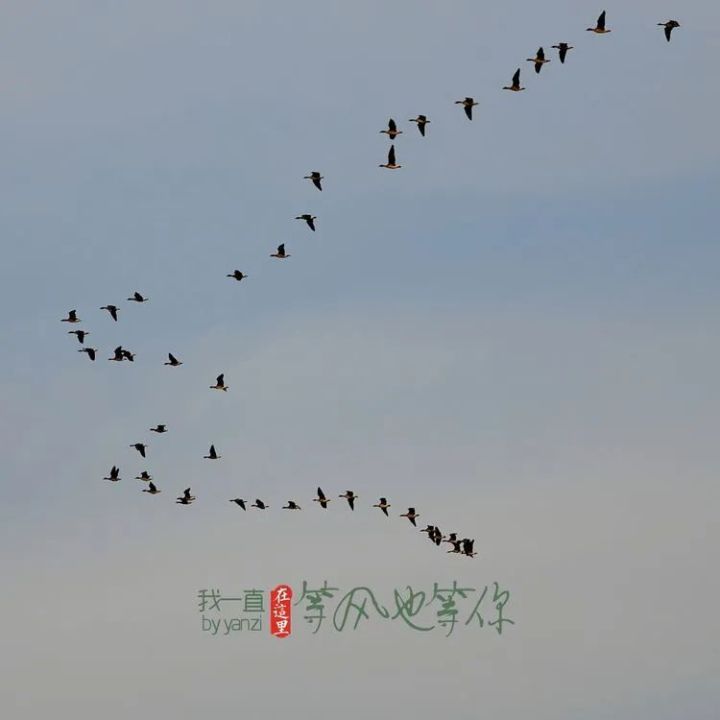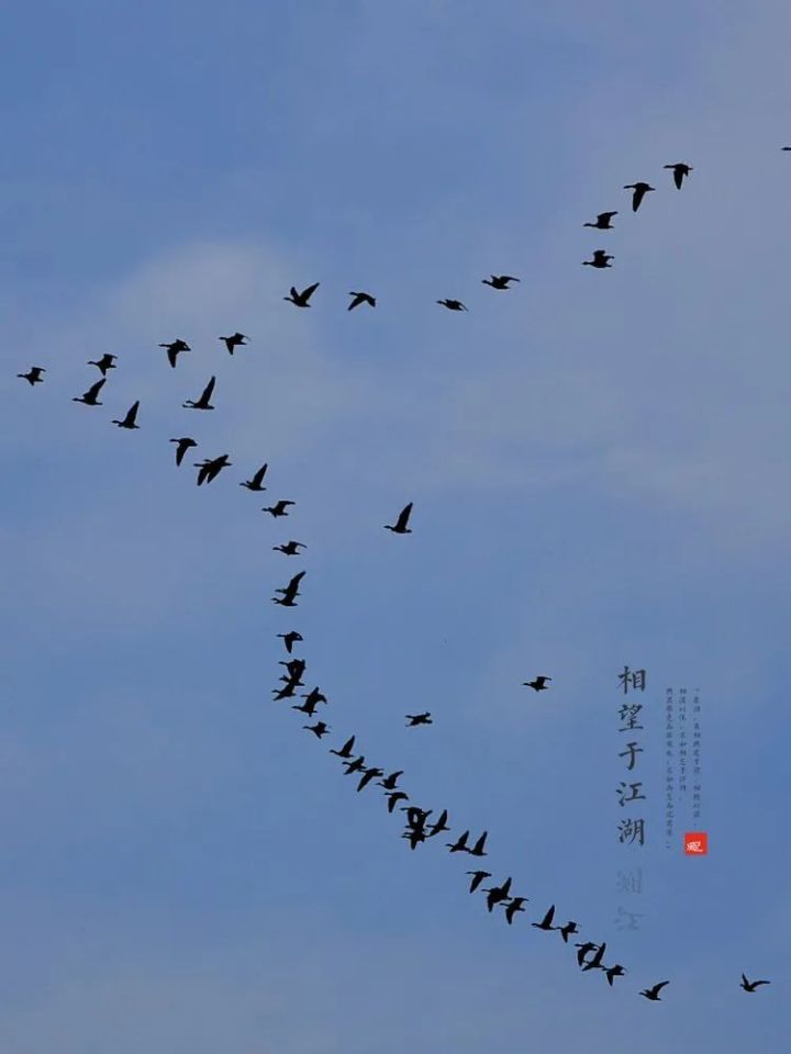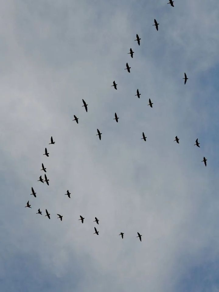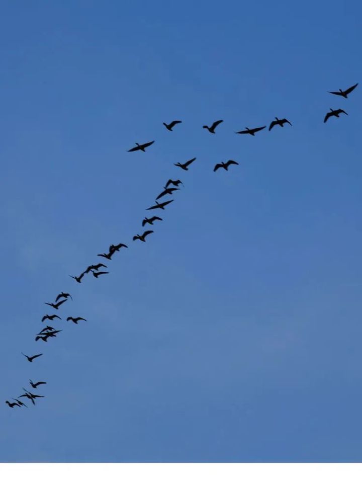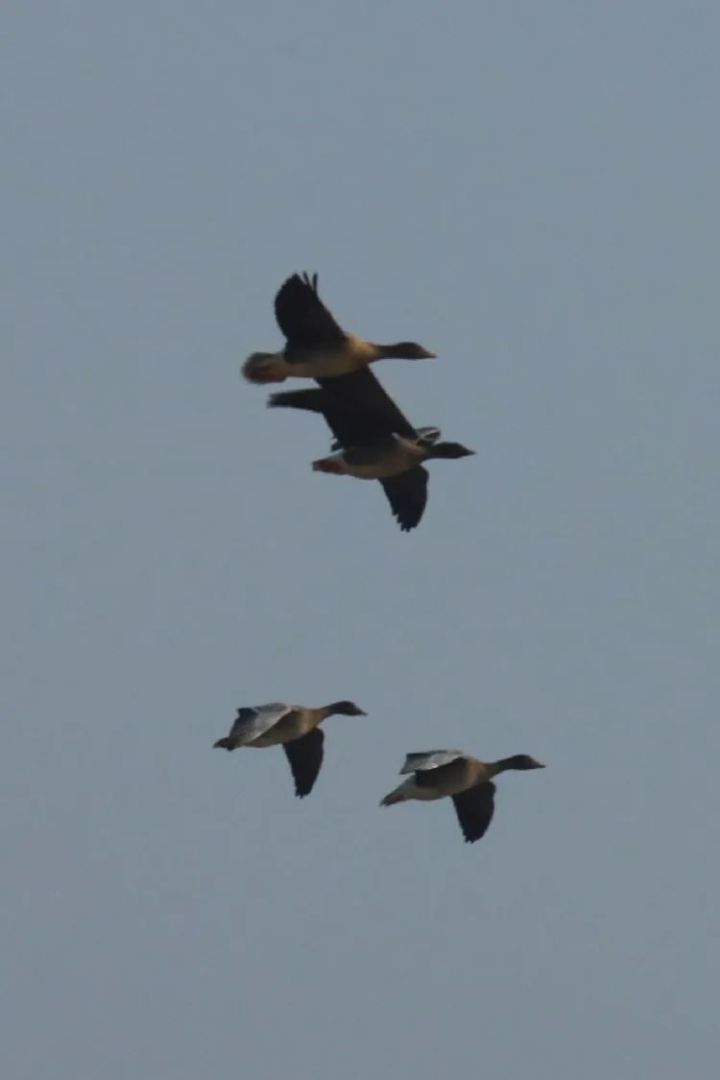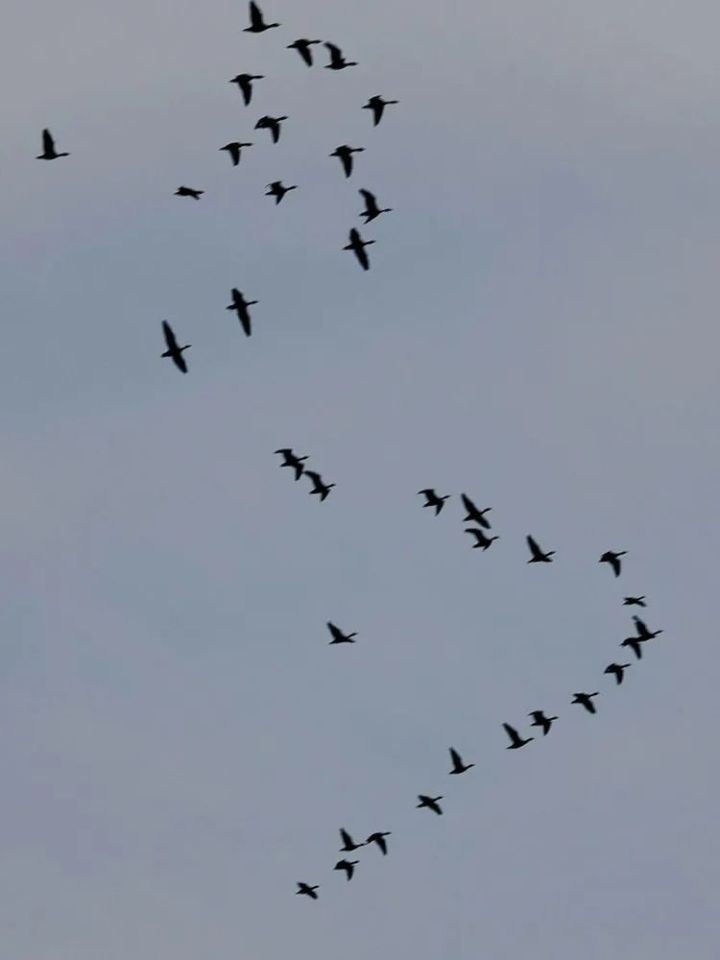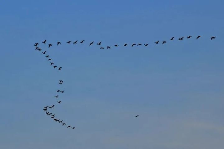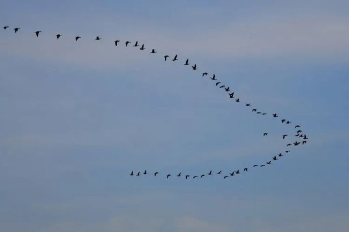 没过多久,成群结对的大雁便在我们头顶飞来飞去,果然像大爷所说的那样壮观。我们很快被这遮云闭日的候鸟群所倾倒,它们时而还变换着队形好像在为我们努力表演着什么。