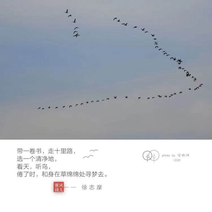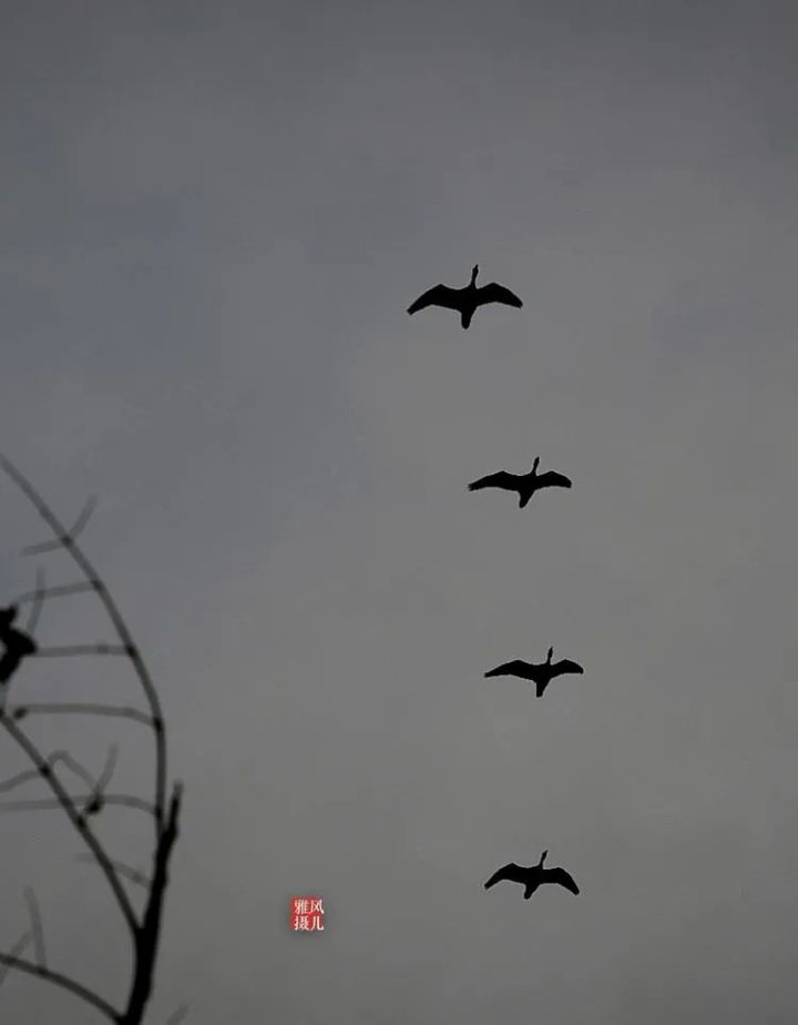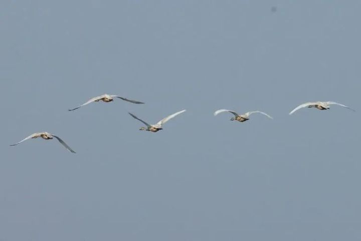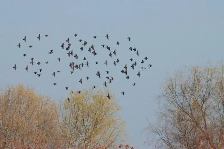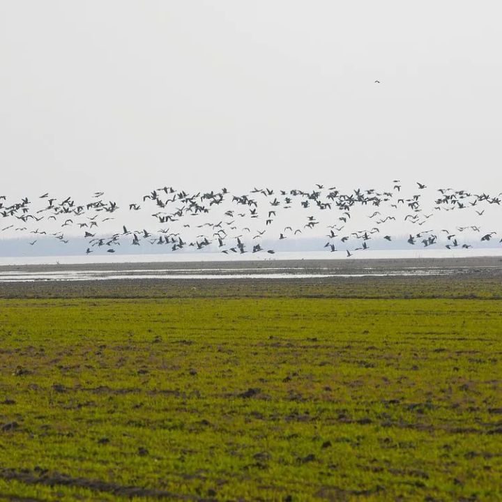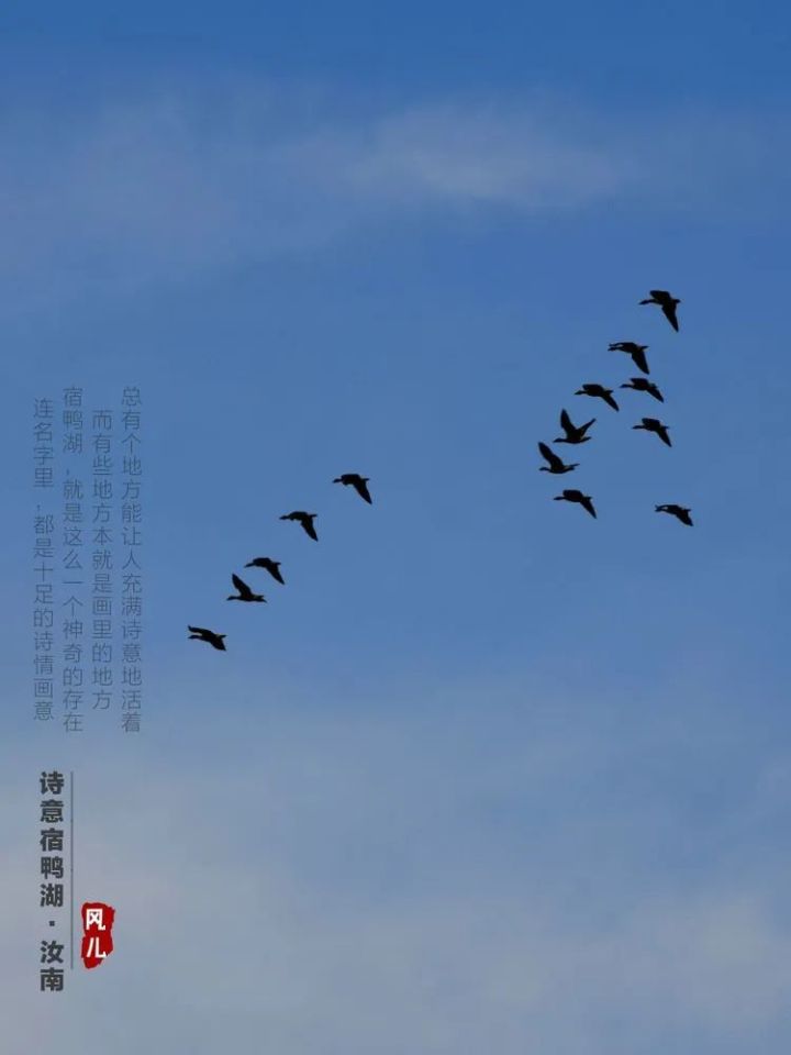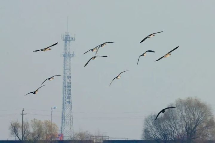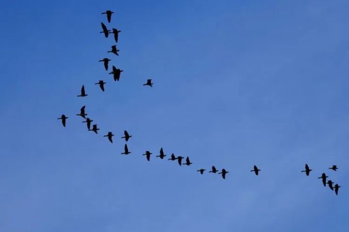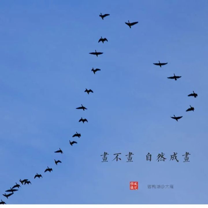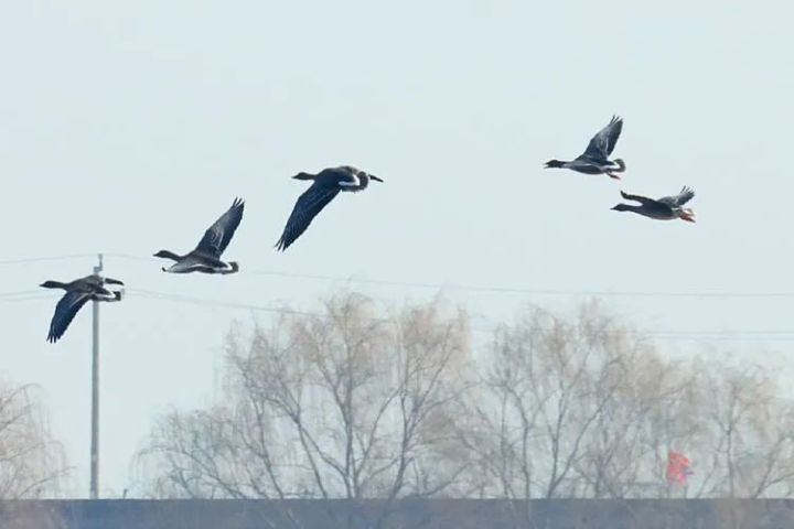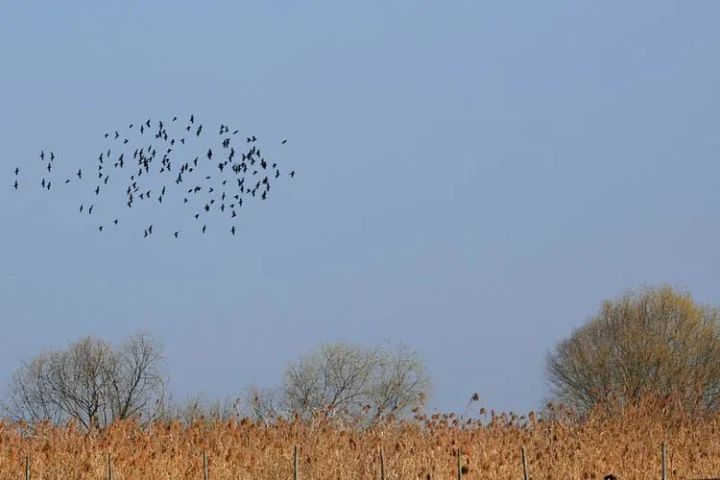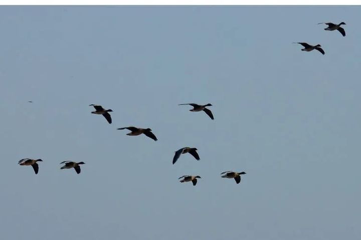 没过多久,成群结对的大雁便在我们头顶飞来飞去,果然像大爷所说的那样壮观。我们很快被这遮云闭日的候鸟群所倾倒,它们时而还变换着队形好像在为我们努力表演着什么。