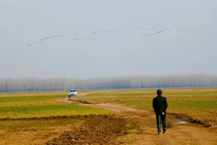 正愁去哪里能拍到更多的大雁时,我们与罗店一大爷在田间不期偶遇。他告诉我们,他知道哪里大雁多,因平常他经常在大雁觅食的地方放牛。热心肠的大爷坐上我们的车,沿着小田埂土路,他把我们领到一处带有水田的麦苗地。