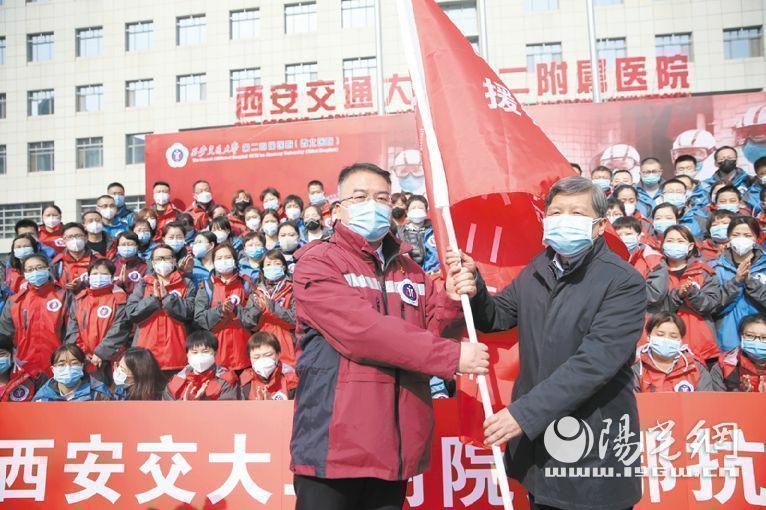 西安交大王树国校长向援湖北医疗队长——交大二附院党委书记巩守平授旗