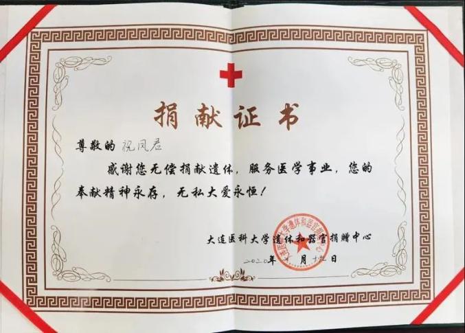 10月18日,双台子区辽河街道辽河社区87岁的祝凤君老人走完了人生旅程。10月19日上午,遵照其生前意愿,在市红十字会、双台子区红十字会工作人员和家人的见证下,祝凤君老人的遗体被大连医科大学接收,完成遗体捐献。“老人的遗体将用于医学教学和临床解剖,用来培养医学院学生,造福人类健康事业。”大连医科大学工作人员表示。