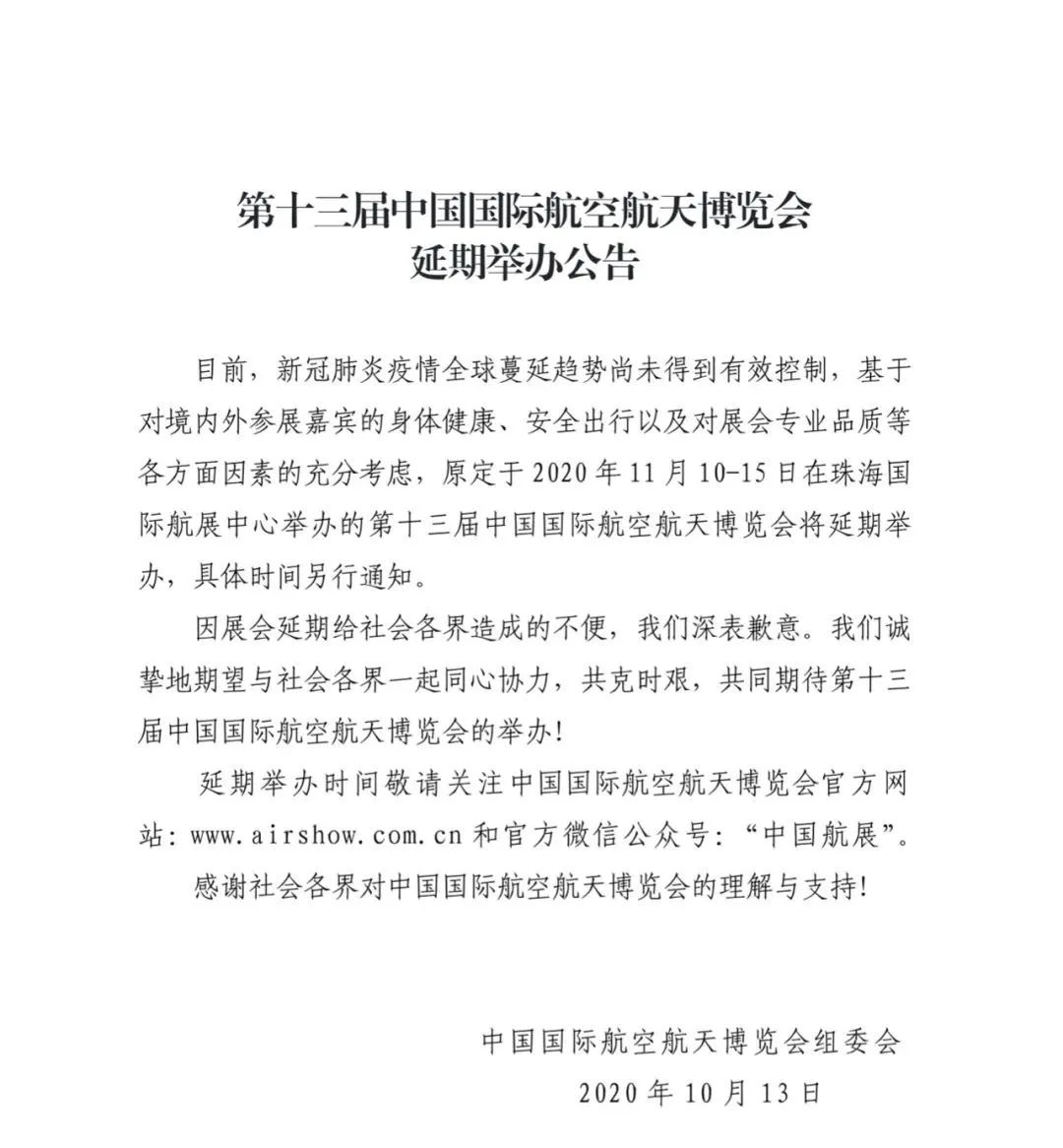 10月13日,中国国际航空航天博览会组委会(珠海航展)宣布,原定今年11月10-15日举行的航展将延期举办,时间待定。完整通告如下: