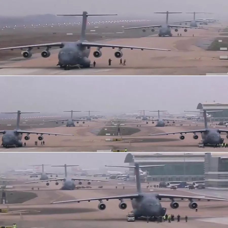 2月13日凌晨,空军出动运20、伊尔-75、运9共3型11架运输机,分别从乌鲁木齐、沈阳、西宁等7地机场起飞,向武汉空运军队支援湖北医疗队队员和物资。上午9时30分许,11架空军运输机全部抵达武汉天河机场。这是我国国产运20大型运输机首次参加非战争军事行动,也是空军首次成体系大规模出动现役中大型运输机执行紧急大空运任务。随着参加任务的多批运输机陆续着陆,镜头也捕捉到了军迷朋友们期待已久的大象漫步画面。6架运-20与3架伊尔-76成两列纵队依次排列,大国重器的气势恢宏令人印象深刻。