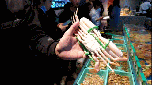 内场主持人在海鲜区为大家介绍海鲜鱼类、虾类、贝类……