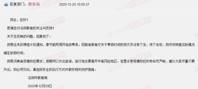 你们好,我想咨询两个问题。第一,洛阳市2021年的小学放假时间按照以往惯例大致在什么时间。第二,结合今年的疫情的情况,寒假想带孩子去外省旅游是否可行。盼回复,感谢!