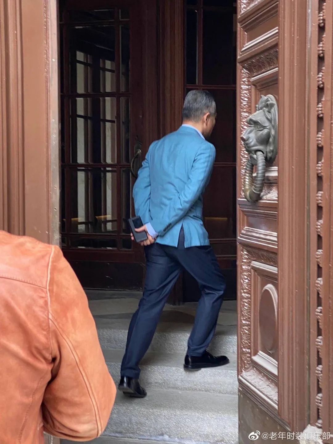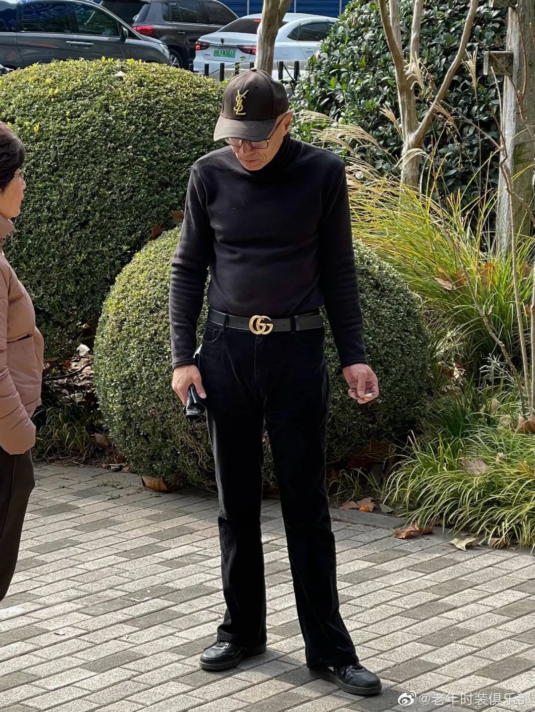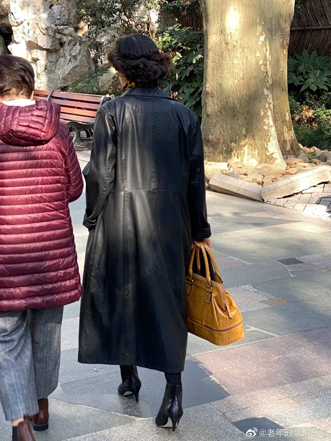 只见那位爷叔穿一袭黑色皮衣,搭配浅驼色人字纹毛呢裤,隐隐露出里面的芋紫色毛线开衫。