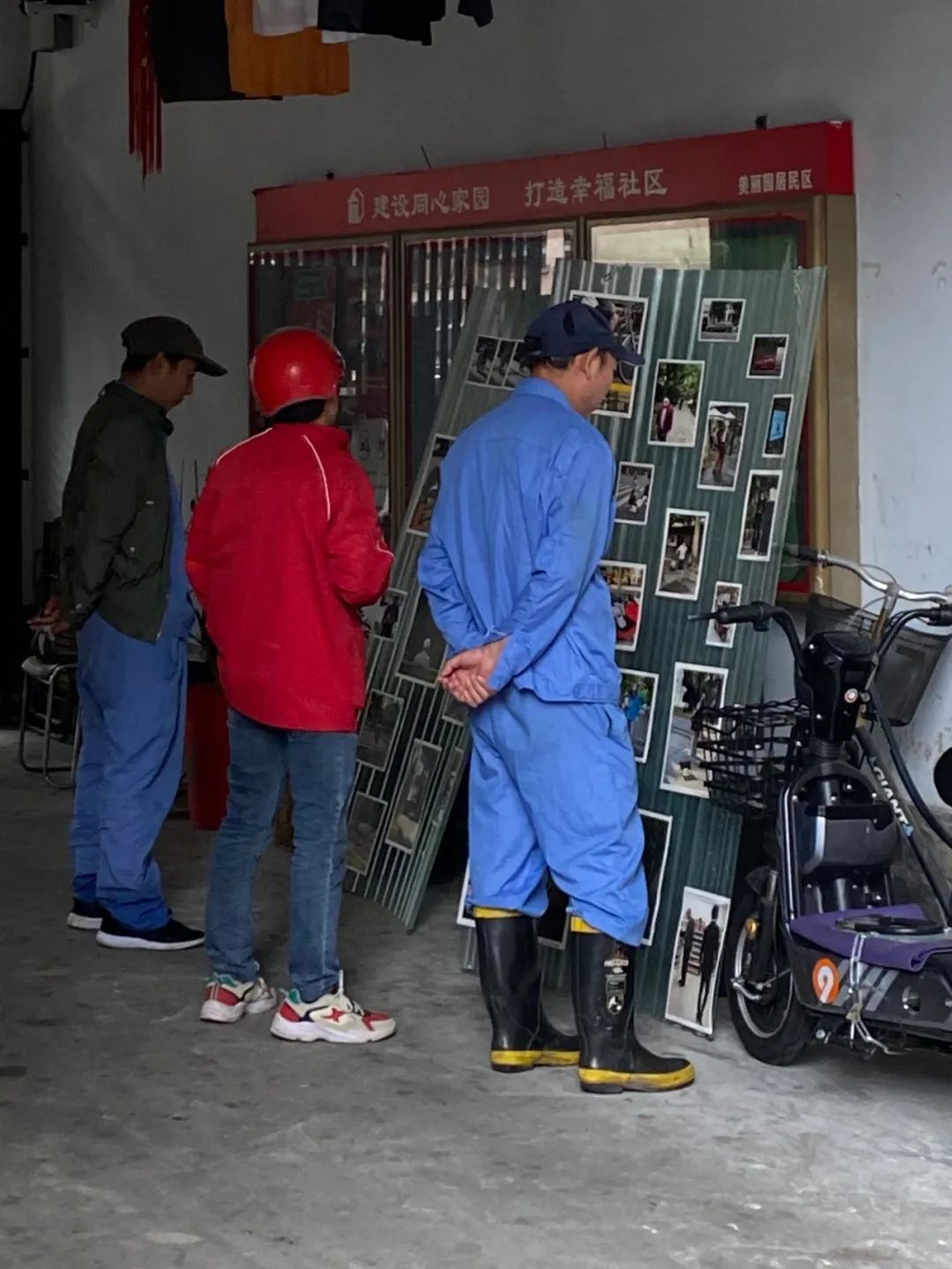 秦霄在小区搬运布展材料时照片被保洁和快递大哥围观了