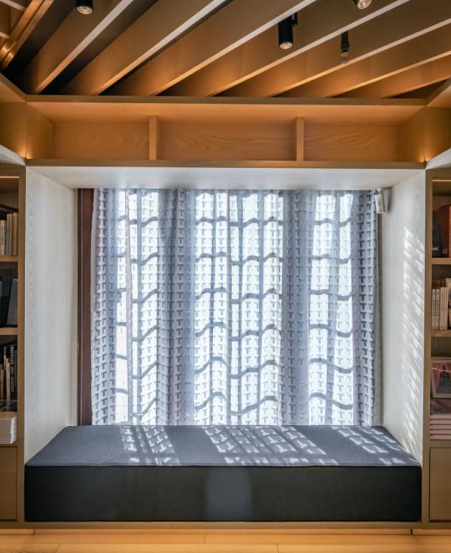 阳光透过带有茑屋logo的窗帘洒进书店中