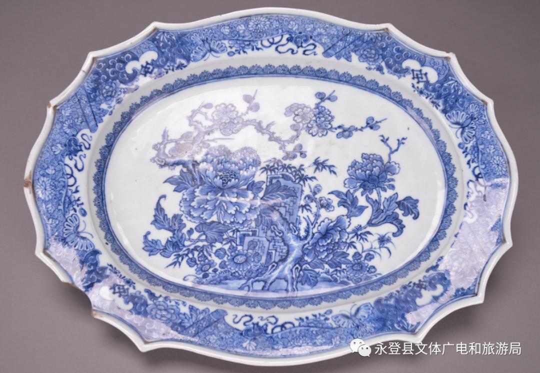 青花瓷盘:径长45厘米,瓷质,菱花葵口,盘沿略外撇,盘心微上凸,沿与底施蓝色花卉。