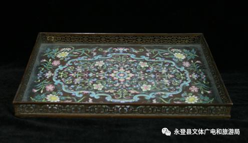 珐琅烟盘:长35厘米,宽26.5厘米,高3厘米,铜质,盘长方体,盘沿镂空,底绘缠枝菊花。