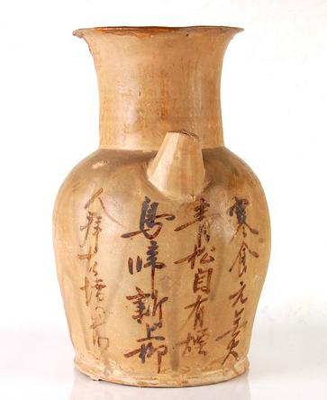 有一对青瓷对坐书写俑,两个戴着高帽的男人,面对面在两块坯料上书写,神态十分夸张幽默。这促使我对一具长嘴陶罐发生了兴趣,陶罐高嘴大肚,其色米黄,上书八个大字:悬钓之鱼,悔不忍饥。字体洒脱不羁,推想其书写之时,应该是心情非常放松的,也许正是酒后。为什么要写上这两句话呢?是禅语吗?是一时之兴吗?倒是有些诗令人惆怅,有一只用于盛水的高腰的、淡黄色陶罐上,沿着壶嘴两边刻了四行诗:一别行千里,来时未有期。月中三十日,无夜不相思。