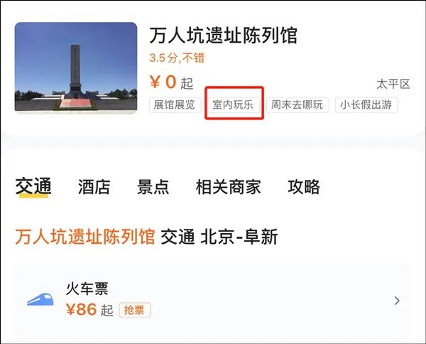 除侵华日军南京大屠杀遇难同胞纪念馆外,该APP在其他许多重要历史遗迹与纪念馆的介绍中也可发现诸如“室内玩乐”、“无肉不欢”等不当标注。