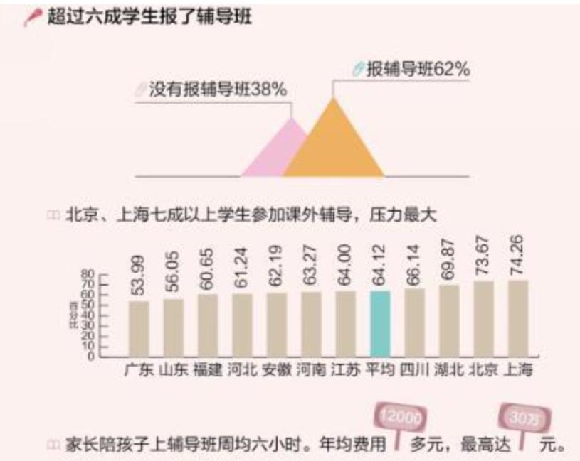 报告显示小学阶段全国各省市 64.12% 的学生上补习班,年均费用1.2万,以广州为例,挖数去过一家著名的英语培训机构调研,小学阶段1年补习费就要2万多。