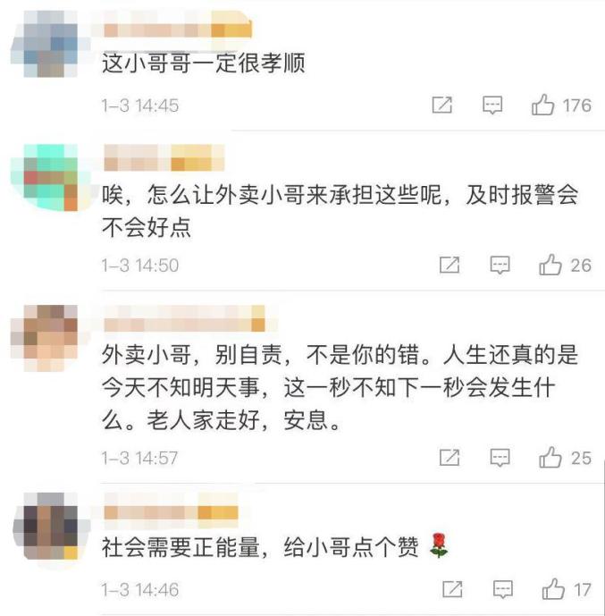 事后,老人的家人表示,这份外卖是他们帮老人点的。因为他们尝试打老人的电话,都没人接,但他们又住得太远,于是想通过外卖小哥,看看家里是不是有人在,老人有没有事。