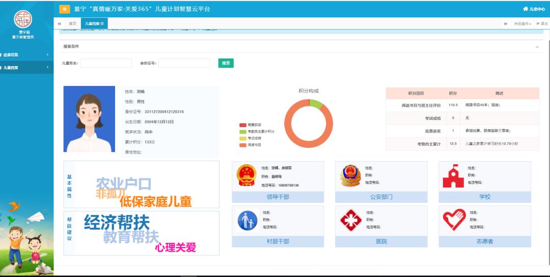 实现儿童数据“云共享”创新开发以“儿童数据库、关爱帮扶清单”为内容的“关爱365”智慧云平台,实现儿童信息“一人一档”,形成部门联动、资源共享的关爱机制。该平台实施“打卡积分”制,设立学习进步、兴趣养成、崇德向善等各类“小成就”奖项,让畲乡儿童在成就感中快乐健康成长。每位留守儿童可以提出需要帮扶的诉求清单,各职能部门根据职责,开展精准的帮助和服务。