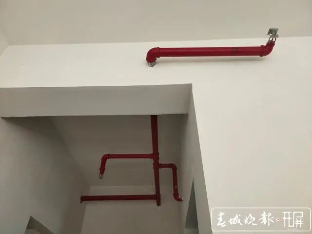 记者观察发现,几乎所有的消防管道都是悬空安装,离天花板还有20~50厘米不等的距离。设置在消防管道上的喷淋也有横竖之分,客厅里基本是横向,其他房间基本是垂直地面。