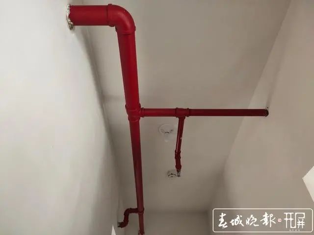 记者看到,消防管道有的沿着天花板边沿安装,有的布满房顶,管道有粗有细,有高有低。其中,安装在客厅一侧的消防管道长度与客厅相当,并穿过承重墙的房梁延伸到主卧、次卧、厨房、卫生间等地。
