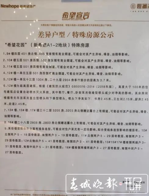 而业主们拿到的房源公示关于12栋楼的提示部分,只有“12号楼一单元五层501房西侧有商业烟道,可能会产生异味、噪音、油烟等影响。”与“12号楼一单元……客厅部分的层高为3.7米。”除此之外,再无其他。
