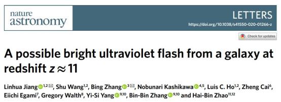近日,北京大学科维理天文与天体物理研究所江林华领衔的国际团队探测到一个134亿光年外星系的光谱,证实了该星系为人类发现的最遥远天体。团队同时还捕捉到来自该星系持续数分钟的爆发信号,疑似与星系中一个伽马射线暴有关。这两项最新研究成果均发表在2020年12月14日的《自然-天文》(Nature Astronomy)杂志上,引起了国际天体物理学界的热议。两项成果对理解宇宙早期星系和恒星形成有重要意义,为研究宇宙极早期天体打开了一扇窗口。