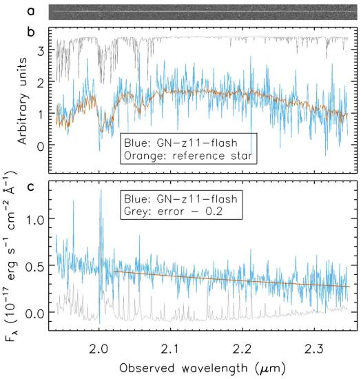 江林华团队利用目前国际上最先进的地面光学红外望远镜之一,即位于夏威夷山上十米口径的凯克(Keck)望远镜,根据此前得到的信息精心设计了观测波段和角度,在近红外波段对GN-z11进行了深度光谱观测,探测到了三条发射线,并基于光谱分析出该星系的准确红移为10.957,证实其为134亿光年之外的星系。