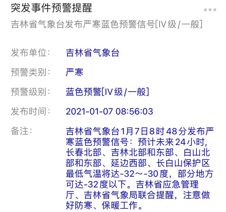 严寒蓝色预警!吉林省气象局启动重大气象灾害(寒潮)Ⅳ级应急响应!
