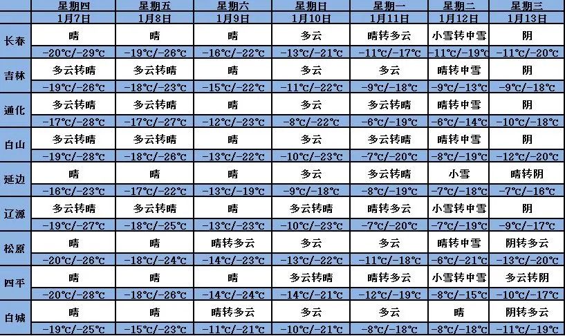 受贝加尔湖强冷空气影响,1月6日开始我省气温再度下降,预计降温幅度为5℃~7℃,部分地方可达8℃以上。吉林省气象台已于1月7日8时48分发布严寒蓝色预警信号,预计未来24小时,长春、吉林、白山、延边、长白山等地最低气温将达-32℃~-30℃,部分地方可达-32℃以下。