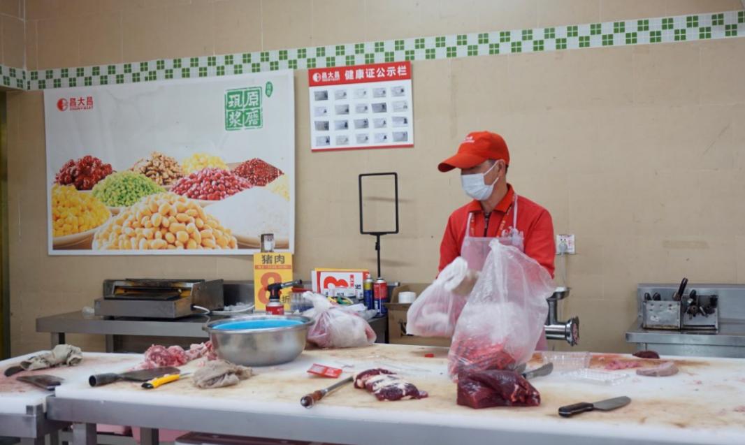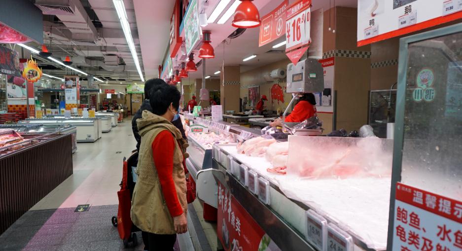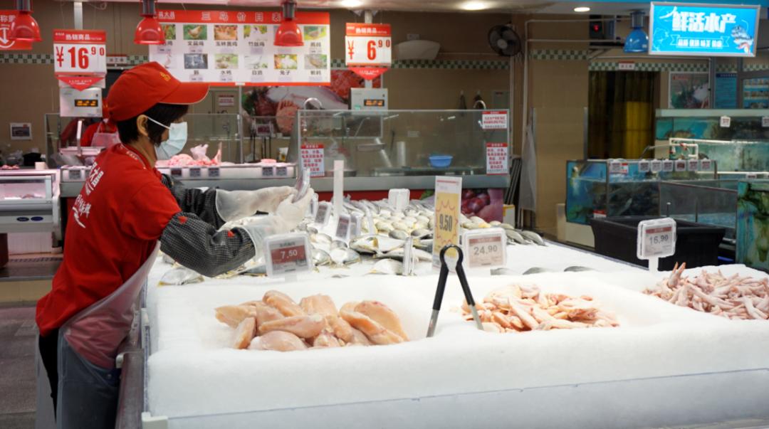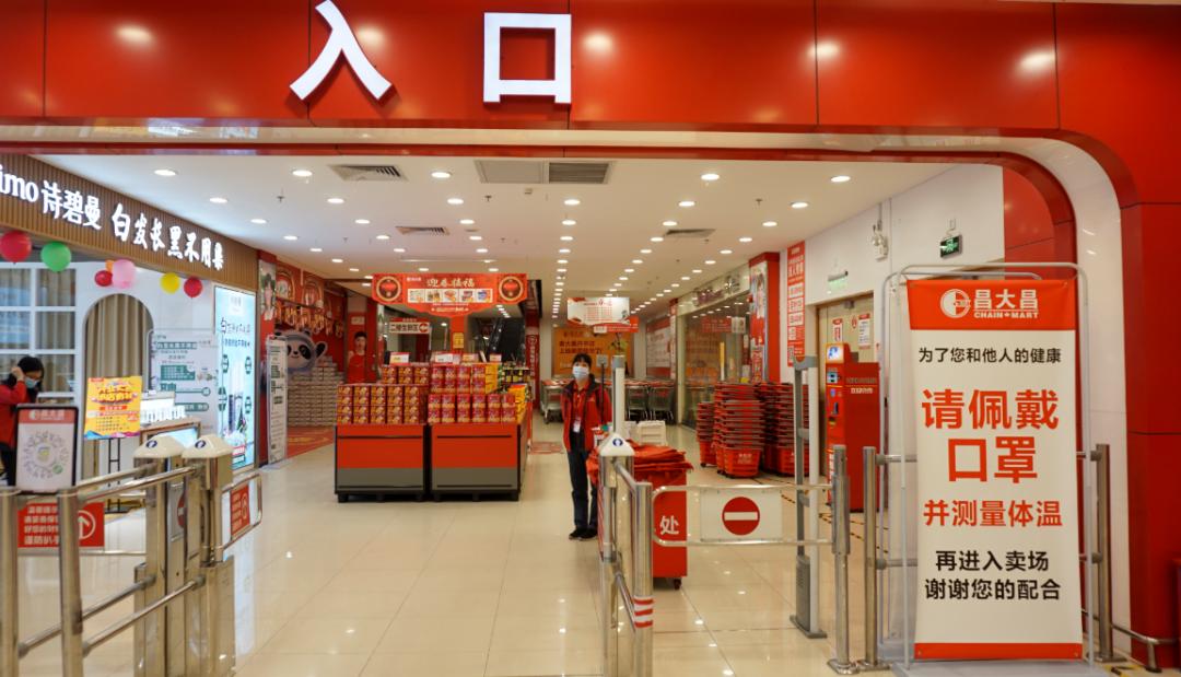 在超市入口处,醒目位置有防疫提示标牌,配备工作人员对进入卖场的顾客进行体温检测,并提醒顾客佩戴口罩。卖场内所有工作人员都佩戴口罩、着工作服上岗,其中生鲜区各个区域的员工都按照防护要求佩戴了工作帽、口罩、防水围裙、手套等。