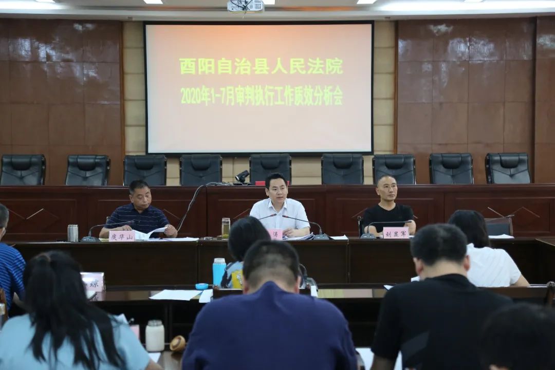 酉阳法院召开上半年审判执行工作质效分析会,对照年度评估指标体系全面梳理总结1-6月份审判执行工作,并对下半年审执工作作出安排部署。7月21日