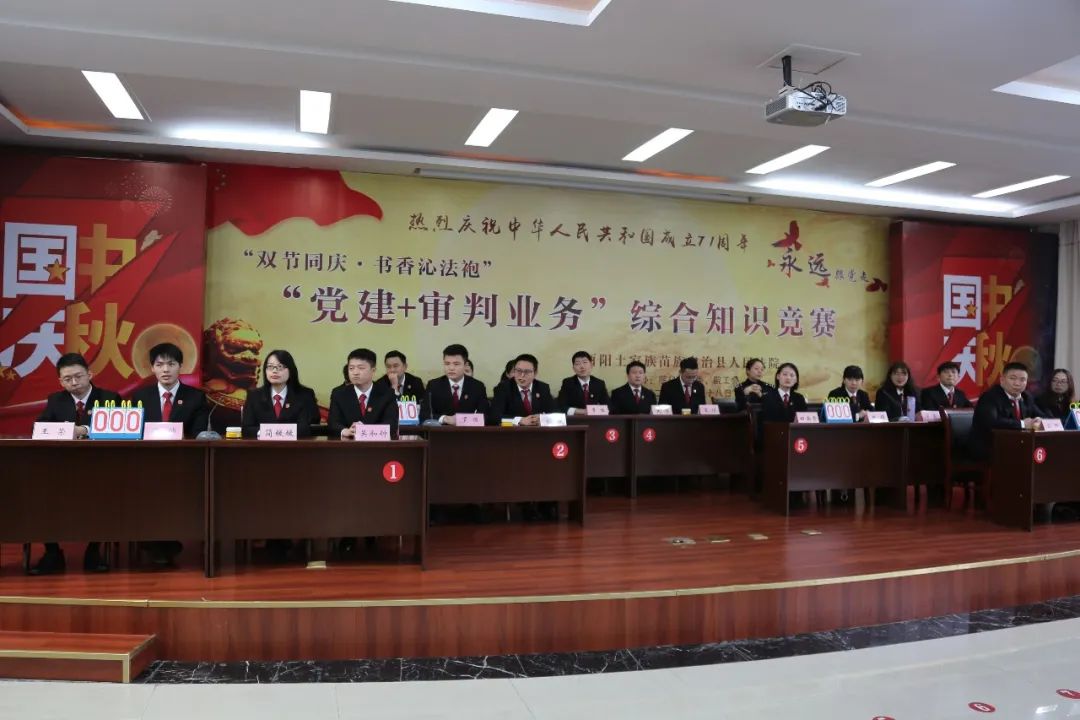 酉阳县法院举行“双节同庆·书香沁法袍”党建审判业务综合知识竞赛活动,隆重庆祝中华人民共和国成立71周年,全国人大代表冉慧,市五届人大代表冯桂英应邀参加。本次知识竞赛的内容涵盖党的建设、审判执行、审判管理业务,设置有选择题、必答题、抢答题、风险题4种题型,全院13个党支部组成6支代表队同台比拼。十 月