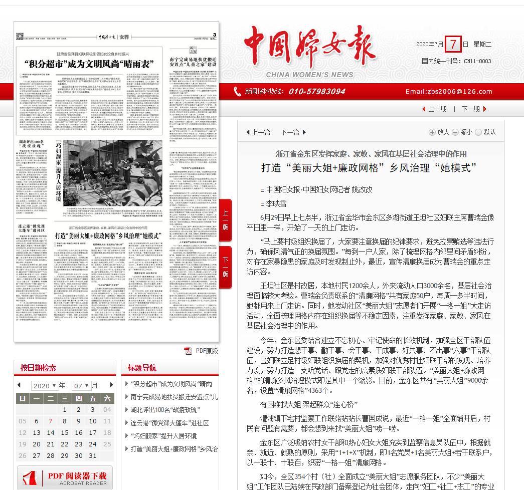 巾帼代表“问政”活动和“美丽大姐+清廉网格”基层社会治理“她”模式获得中国妇女报、学习强国、浙江信息正面宣传。