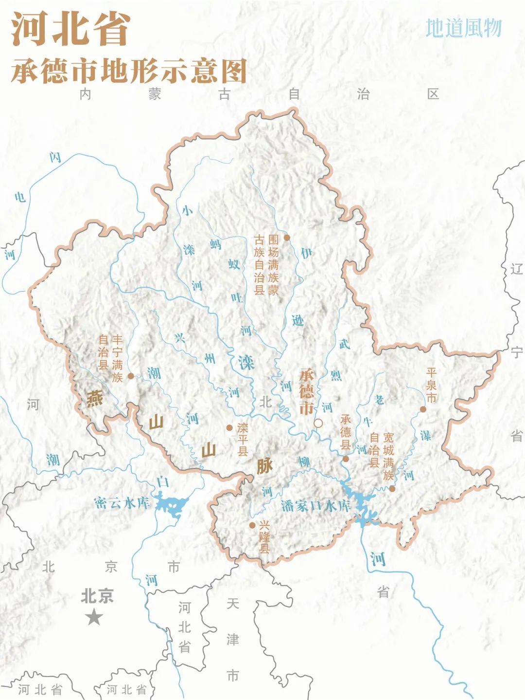 ▲ 河北省承德市地形示意图。制图/伍攀内蒙古高原到华北平原过渡地带的地理区位,让承德的地貌变得复杂而有特色。承德北部的坝上高原是内蒙古高原的南边缘,中部是中低山区,南部横亘着燕山山脉,也是这道山为北京乃至华北平原阻挡了部分冬日的严寒。承德整体地势从西北的坝上高原往东南燕山山地逐渐降低。