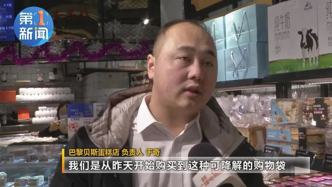 该蛋糕店负责人于奇:‘“我们是从昨天开始购买到这种可降解的购物袋,因为我们在外打包这一块儿使用量比较大,所以说现在目前为止我们是使用了一部分,外打包这一块儿使用这个可降解的袋子。后续我们也逐步的来一点点更换,因为考虑到成本的原因,还有这个可采购的条件,我们也在积极响应号召,在找各方面的渠道来解决这个问题。"