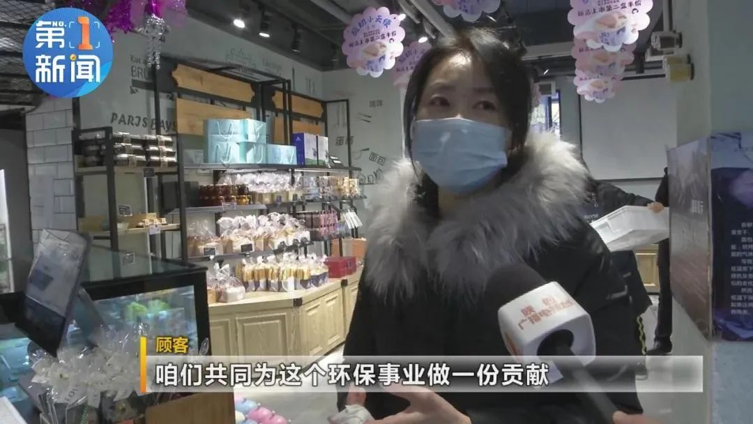蛋糕店员工:“现在我们这个塑料袋是可降解塑料袋,环保的,可以重复使用,希望下次,你们来的话就可以自备(循环袋)。”