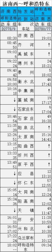 以上途经车站购票乘车情况以当地疫情防控要求为准● 自1月20日起,每日开行呼和浩特东至济南西D2780/7次动车组列车。运行时刻:呼和浩特东09:34开,19:01到济南西。