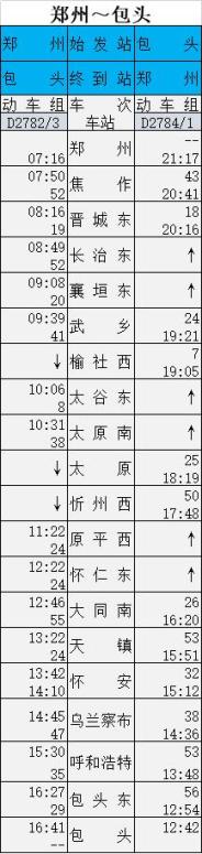 ● 自1月20日起,每日开行包头与郑州之间的动车组列车。D2784/1次12:42包头站发车,21:17终到郑州;D2782/3次7:16郑州发车,16:41终到包头。