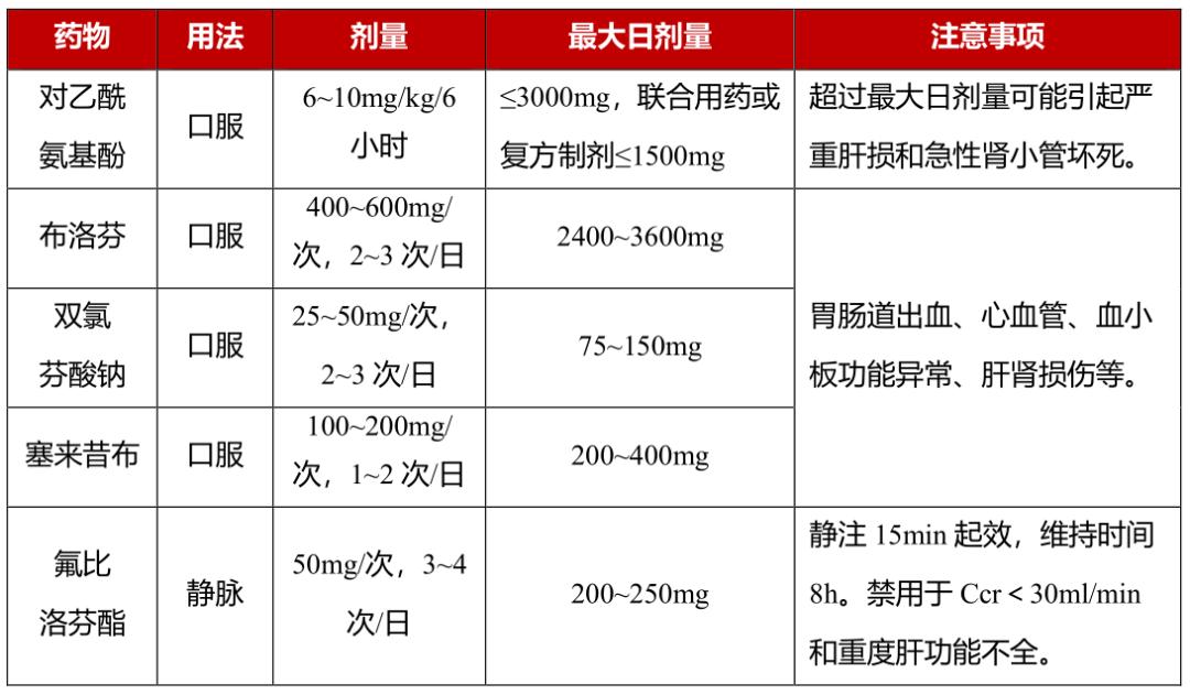 分化型甲状腺癌术后会出现咳嗽疼痛、吞咽疼痛及切口疼痛,一般可以忍受。若疼痛剧烈,影响日常生活,可酌情使用非甾体抗炎药(NSAIDs),如:对乙酰氨基酚、布洛芬、双氯芬酸、塞来昔布、氟比洛芬酯等单药使用,或对乙酰氨基酚联合非选择性NSAIDs或选择性COX-2抑制剂,两种联合按常规剂量½使用,可发挥协同作用,降低痛感,有利于患者早期经口进食(具体使用方法及注意事项见表1)。