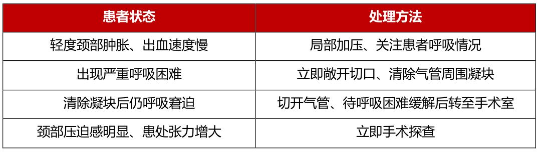 术后应使用药物预防术后呕吐、避免咳嗽、颈部剧烈运动,合理控制血压。若术后不幸发生出血,轻度的可局部按压。术后出血多发生于术后24h内,严重者可迅速形成颈部血肿,有压迫气管引起窒息的风险。若患者出现以下症状,处理方法如下(表2):