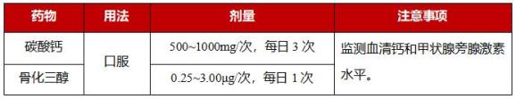 甲状旁腺功能减低:术后大部分甲状旁腺功能减低是暂时性的,少部分为永久性。目前甲状旁腺功能减低的主要治疗方法为补充钙剂、维生素D治疗和甲状旁腺激素替代治疗,甲状腺全切术后预防性补钙可有效减少低钙症状的发生,对于术后永久性甲状旁腺功能减低是很难通过钙剂和维生素D制剂长期维持目标血钙稳定,近来甲状旁腺激素替代治疗显示出一定优势,但其长期使用的有效性和安全性仍有待研究。建议同时监测血清钙和(或)甲状旁腺激素水平,指导临床补钙。具体用法如下(表3):表3治疗甲状旁腺功能减低药物的用法用量及注意事项