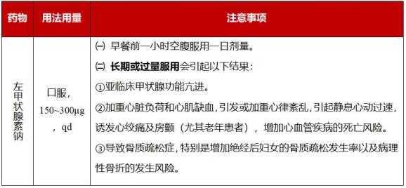 促甲状腺激素(TSH)抑制治疗:术后应及时进行TSH抑制治疗,初始抑制目标基于初始复发危险度分层制定,首选左旋甲状腺素(L-T4)口服制剂,定期复查血清甲状腺功能以调整药量、维持促甲状腺素于目标范围。需要长期将TSH抑制在小于正常值下限的患者,应定期随访,结合动态复发危险度分层和副反应风险制定个体化促甲状腺素抑制目标。具体L-T4药物治疗见(表4):