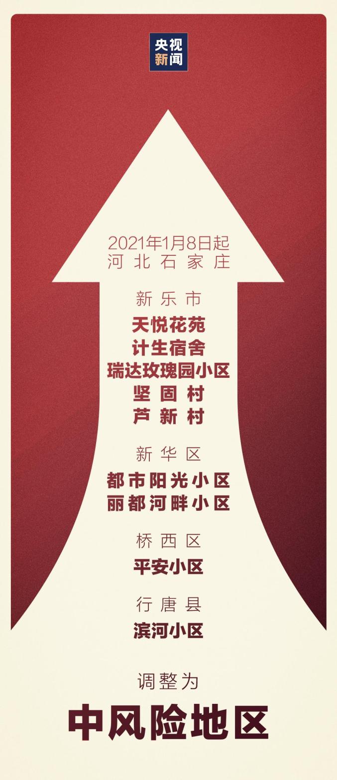 自1月8日起,将石家庄新乐市天悦花苑、计生宿舍、瑞达玫瑰园小区、坚固村、芦新村,新华区都市阳光小区、丽都河畔小区,桥西区平安小区,行唐县滨河小区调整为中风险地区。