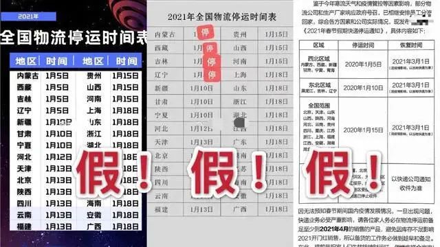 近日“全国快递停运时间表”在网络流传,并称快递服务因部分区域疫情原因受影响,甚至影响春节快递服务。