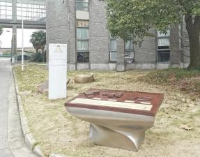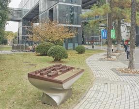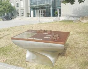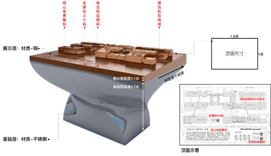 空间形态阅读——嘉定校区整体建筑风格较现代。建筑在空间构成上各自具有特色,但往往行人视角很难对建筑整体形态有所感知。选取不同的组团,以建筑互动沙盘的形式,对建筑原有的三维形态进行抽象,通过具有现代感的铸铜材质呈现,构筑微缩的建筑三维形态,为观览者呈现建筑的总体形象感知。金属材质外观现代,且不易损坏,随时间的推移会与周边环境共生,结合环境相得益彰。核心信息阅读——以腐蚀、刻字形式,在金属沙盘表面呈现建筑的核心信息,使校内、校外的观览者可以第一时间了解建筑的主要信息,形成直观的阅读体验。
